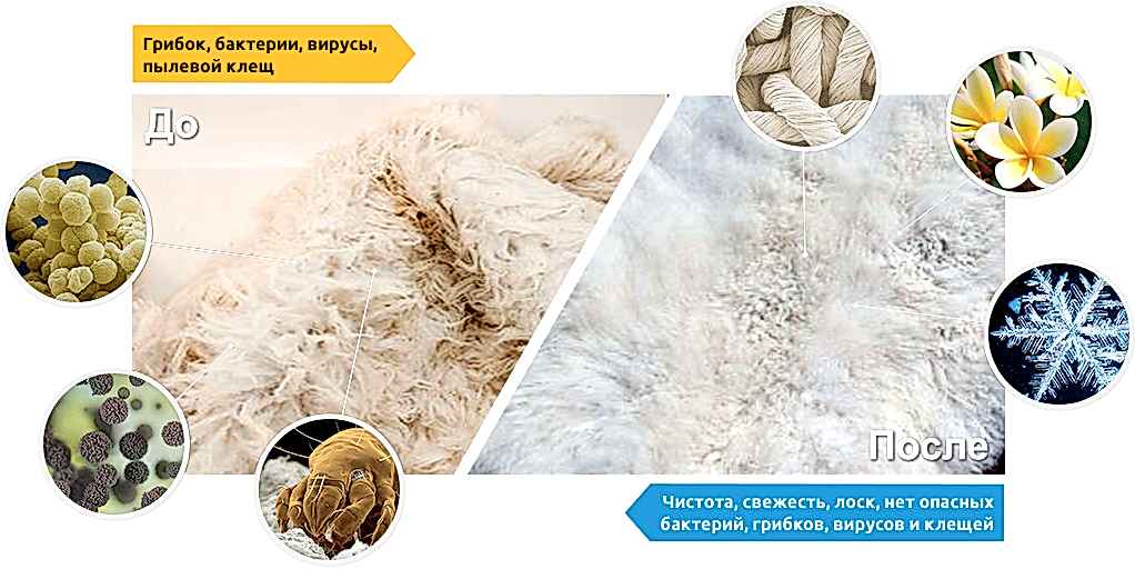 Благодаря специальным технологиям, позволяющим глубоко проникать чистящим средствам в покрытия, из изделий как с внутренней, так и с наружной стороны удаляются, разные бактерии, пылевые клещи, микробы, шерсть животных, застарелые пятна, а также различные неприятные запахи.