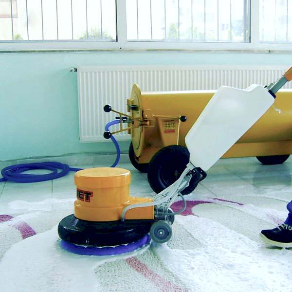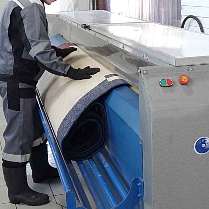 Изделие с начало смачивается специальным моющим средством, предназначенным конкретно для данного покрытия, далее при помощи профессиональной роторной машины для стирки ковров происходит цикл чистки и удаления загрязнений, удаление пятен различного характера. Для каждого изделия используется специальная щетка, предназначенная именно для данного покрытия. Ковровое изделие полностью моется с двух сторон, ополаскивается и отправляется на сушку в центрифугу.
