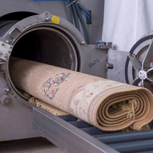 После того, как ковер тщательно постирали и ополоснули он отправляется в центрифугу, где производится дополнительное полоскание и отжим изделия, после данного цикла, практически сухой ковер (отжим до 95% влаги), изделие отправляется в сушильное помещение.